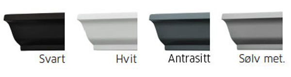 Våre 8 elegante farger er valgt ut ifra de mest populære fargene hos våre kunder. Fargene passer godt inn på de fleste hus, enten du vil ha synlige takrenner eller mer anomyme som glir inn i veggfargen.